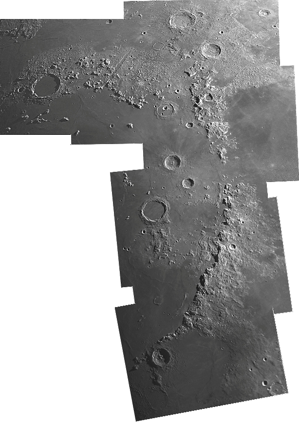 Ecco a voi Plato il cratere in alto a sinistra , Aristotele quello in alto centrale, scendendo troviamo Eudoxus, la triade Aristilluis,Autolycus e Archimede, ed in fine Eratosthenes e i crateri minori. Una lunga catena montuosa li accompagna.