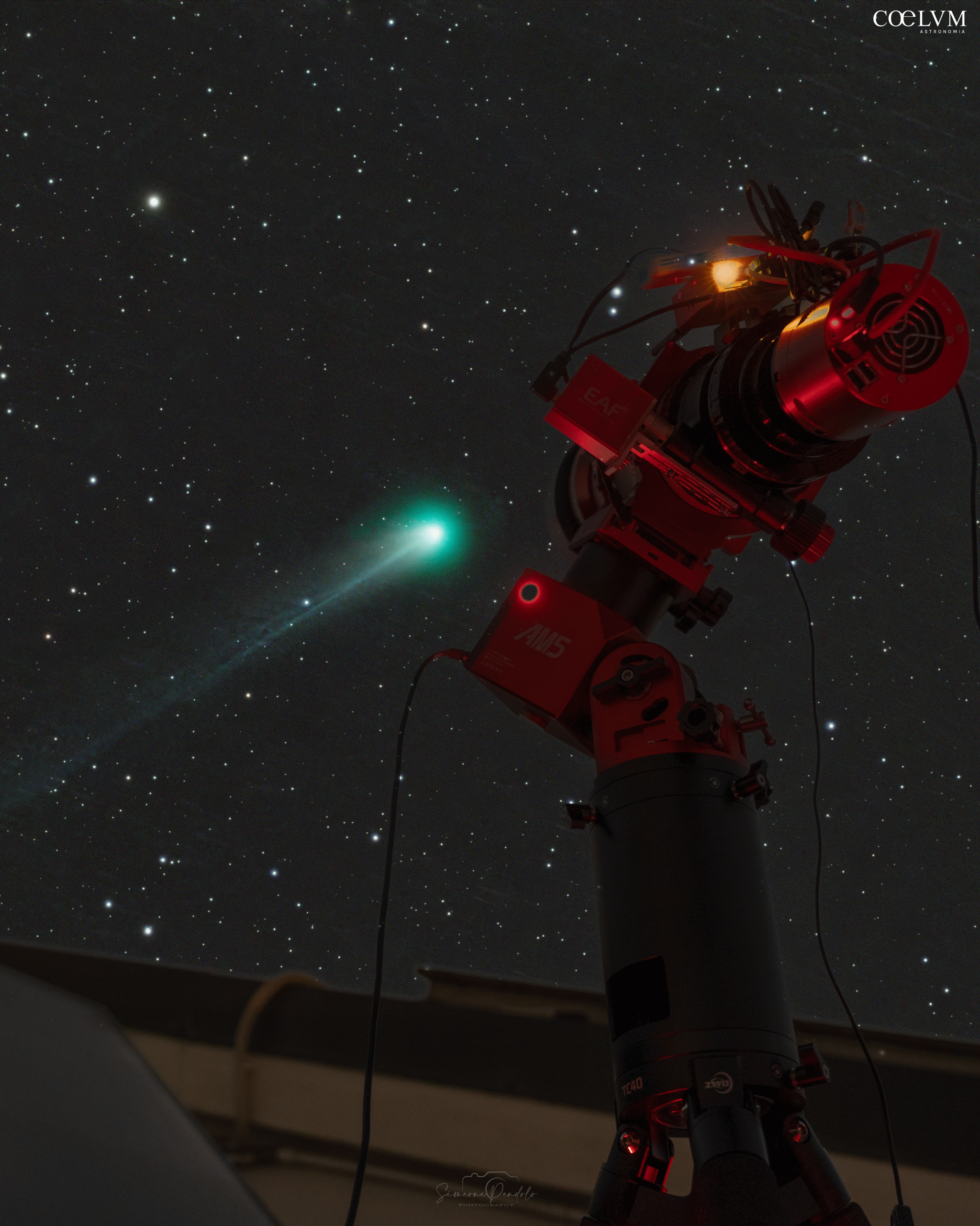 In questa immagine, realizzata dal tetto del mio condominio, la cometa attraversa il cielo notturno con la sua chioma verde brillante e la sottile coda ionica. Lo scatto nasce dall’unione di una posa per il paesaggio fatta con Sony A7III e Sony 50mm e 30 pose da 60 secondi ciascuna per il cielo realizzato con lo stack della cometa. Le foto alla cometa sono state realizzate con telescopio Askar FRA600 ridotto a 0,7X e camera ASI2600MC Pro con montatura AM5. Un esempio di come l’astrofotografia possa raccontare meraviglie celesti anche da contesti urbani, fondendo tecnica e bellezza natura.