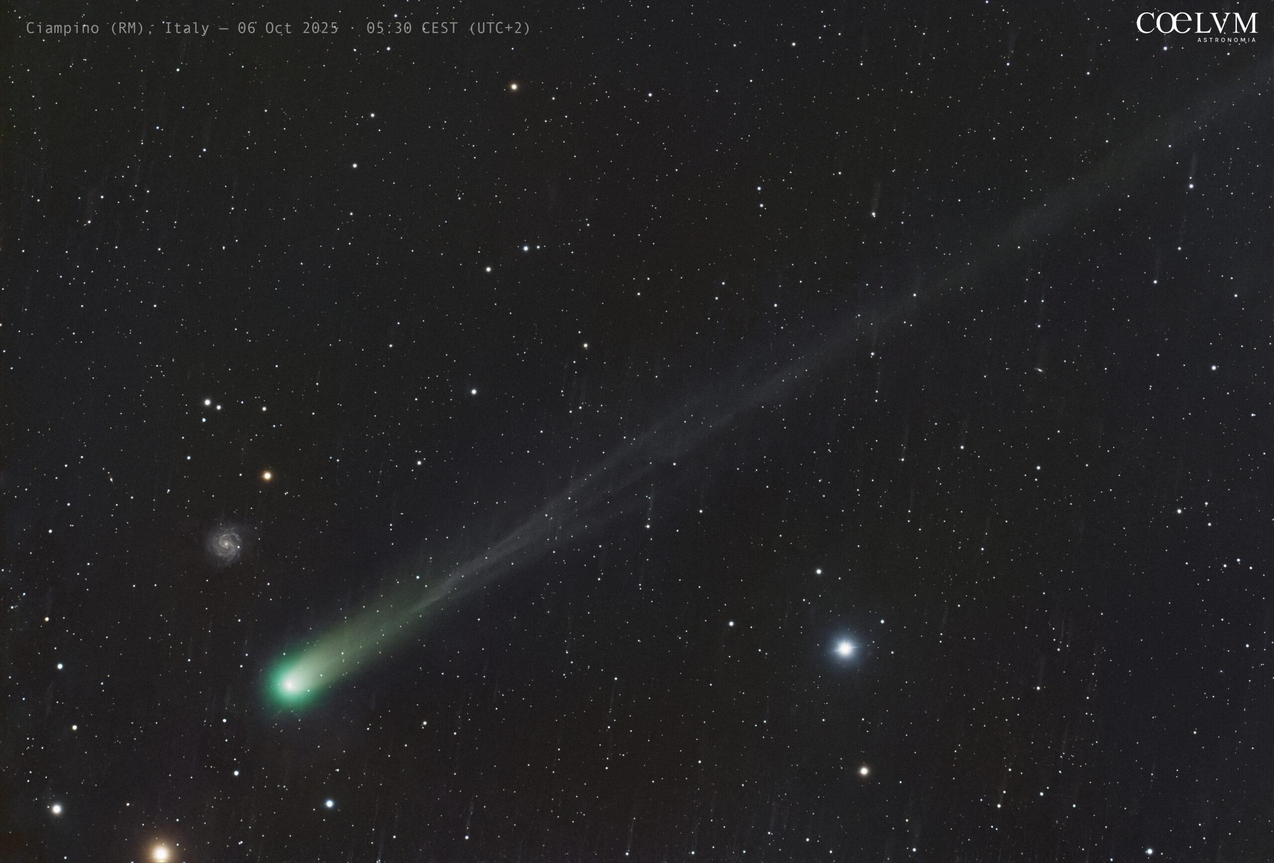 Non sempre le migliori immagini astronomiche nascono sotto cieli perfetti: a volte la sfida sta proprio nel catturare oggetti deboli nonostante condizioni avverse. È quanto accaduto nelle notti del 6 ottobre 2025, quando ho seguito la cometa C/2025 A6 dal cielo fortemente inquinato di Ciampino (Roma, Bortle 7), con la Luna piena che il 6 ottobre era illuminata al 100%. Per affrontare la luminosità del cielo urbano ho scelto un set-up veloce e sensibile: Askar FRA600 + riduttore 0,7× (focale ~420 mm f/4,2), ASI2600MC Pro, montatura AM5, pose da 60″ per circa 1h Camera: ZWO ASI2600MC Pro (APS-C, 3.76 µm/pixel), raffreddata a –5 °C, gain 100. Montatura: ZWO AM5 in modalità equatoriale, con autoguida tramite OAG Esposizioni: pose singole da 60″, per un’integrazione totale di circa 1 ora. Calibrazione: dark, flat e dark-flat Software: pre-processing in Siril con allineamento delle stelle e la calibrazione, DSS per lo stack sulla cometa e la rifinitura e bilanciamento cromatico in PixInsight. La notte del 6 ottobre ha regalato un incontro prospettico particolarmente suggestivo: il passaggio della cometa nei pressi della galassia spirale NGC 3184 (mag ~9,8, distanza ~40 milioni di anni luce) nella costellazione dell’Orsa Maggiore. Un contrasto affascinante tra un corpo ghiacciato del Sistema Solare, destinato a mutare rapidamente, e una galassia remota, immutata da milioni di anni.