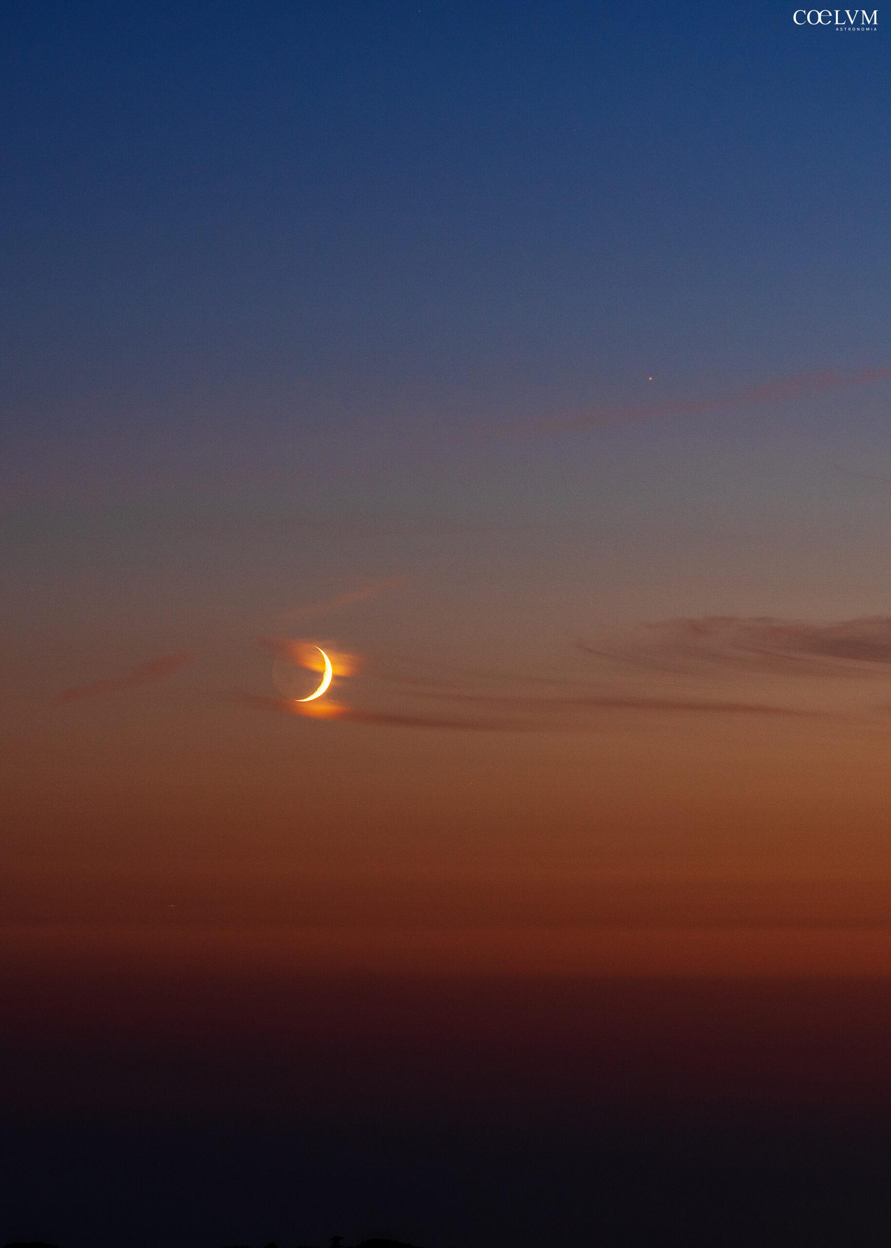 Nelle sfumature del tramonto, il sottile falcetto di Luna crescente si avvicina a Marte in un abbraccio celeste sospeso tra luce e colore. La tenue luce cinerea rivela il volto intero del nostro satellite, mentre il Pianeta Rosso brilla poco più in alto, come un complice discreto. Un incontro raro e suggestivo, che ricorda come il cielo sappia intrecciare poesia e astronomia in uno spettacolo che incanta lo sguardo.
