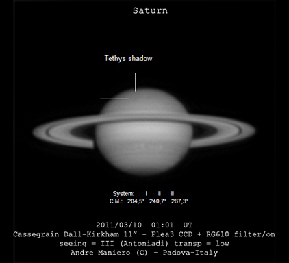 Si intravede debolmente ma si nota l’ombra del satellite Tethys in transito sul disco planetario .