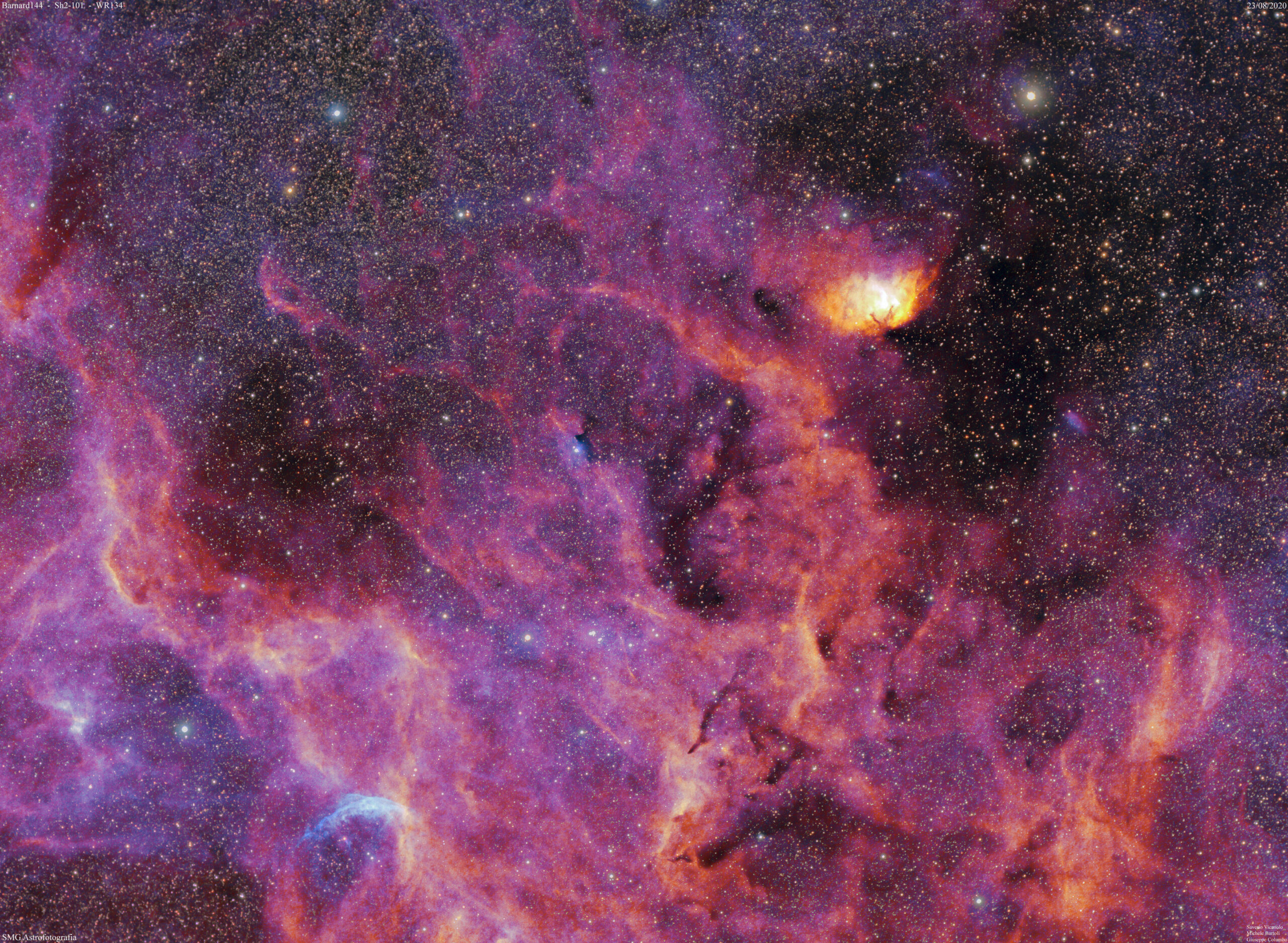 Questa immagine contenente la piccola nebulosa Tulipano Sh2-101 (color giallo-arancio in alto a destra) nella più vasta Barnard 144 e i venti stellari (color ciano in basso a sinistra) della stella WR134 è un esperimento di elaborazione.