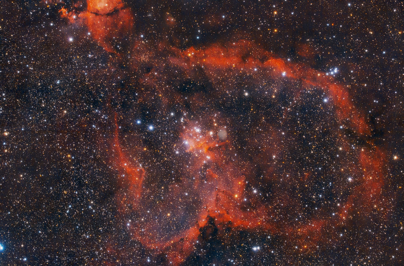 Nebulosa IC 1805 in cassiopea nota anche come nebulosa cuore. 27 pose da 10 minuti a 800 iso con canon 1100d ( coldbox) a fuoco dello skywatcher 80ed con spianatore su neq6, telescopio guida skywatcher 70/500 con ccd asi 120mm mono; tutti i frames sono stati calibrati con dark, bias e flat che non hanno funzionato bene.