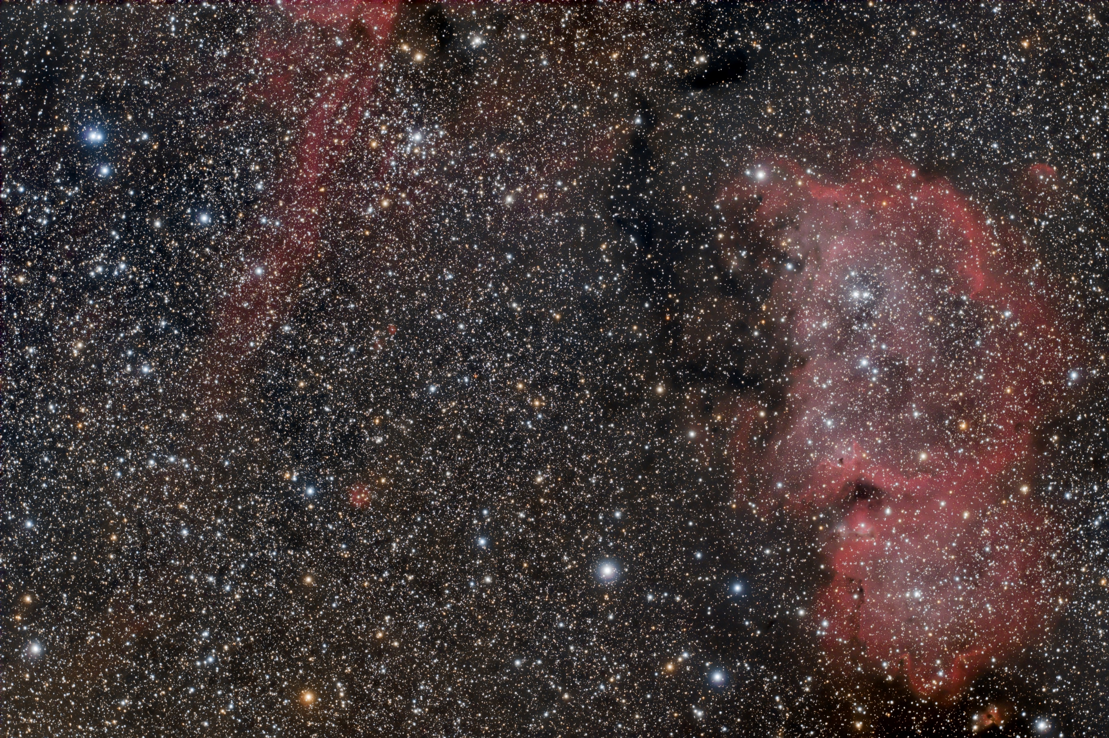 trasferta di sabato 29/10 a Capracotta SQM 21.1.. In attesa del secondo pannello che dovrei riprendere nella luna nuova di novembre, che include la nebulosa cuore, questo pannello invece contiene la IC1848 ( nebulosa anima). Sono 58 pose da 600s 800iso riprese con canon 1100d mod baader a fuoco del ts 70.420 ridotto a 336 su neq6 mod Rowan. Elaborazione con pixinsight e ps