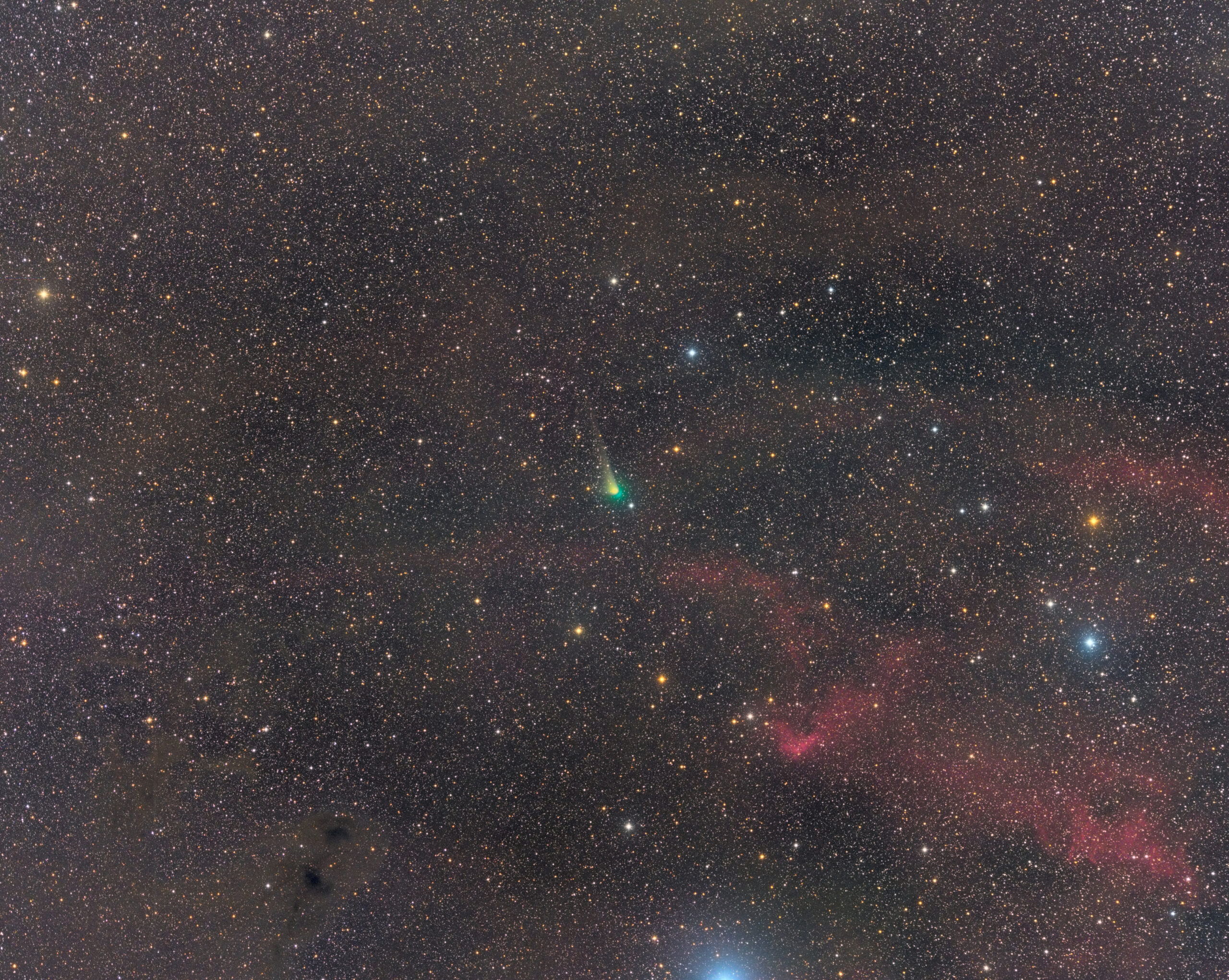 The image shows Comet C/2017 K2 (PanSTARRS) passing by the interstellar dust in the constellation of Ophiuchus.