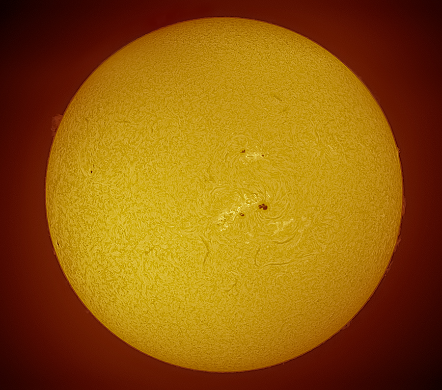 setup: integrazione gli 400 migliori frame da filmati di 500 filtro Solarsocpe 60 su pentax 75, Lumenera skynyx 2.1 sommati con AviStack 2.0 e elaborati con Photoshop.