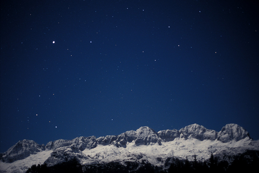 La catena quasi "dolomitica" del Monte Canin (2587m) ripresa dal suo lato settentrionale sullo sfondo di Sirio, alpha Canis Majoris, e della Lepre. Posa di 16 secondi su pellicola Kodak E200 e fotocamera reflex Nikon EM.