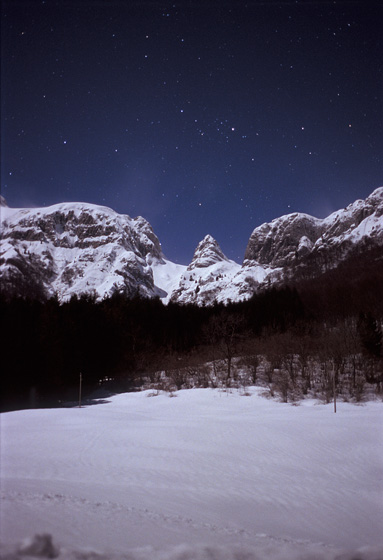 Il noto sperone di roccia presso la Sella Chianzutan (955m) in provincia di Udine, alle pendici del Monte Verzegnis (1915m). Sullo sfondo parte della costellazione di Perseo. Posa di 15 secondi su pellicola Kodak E200 e fotocamera reflex Nikon EM.