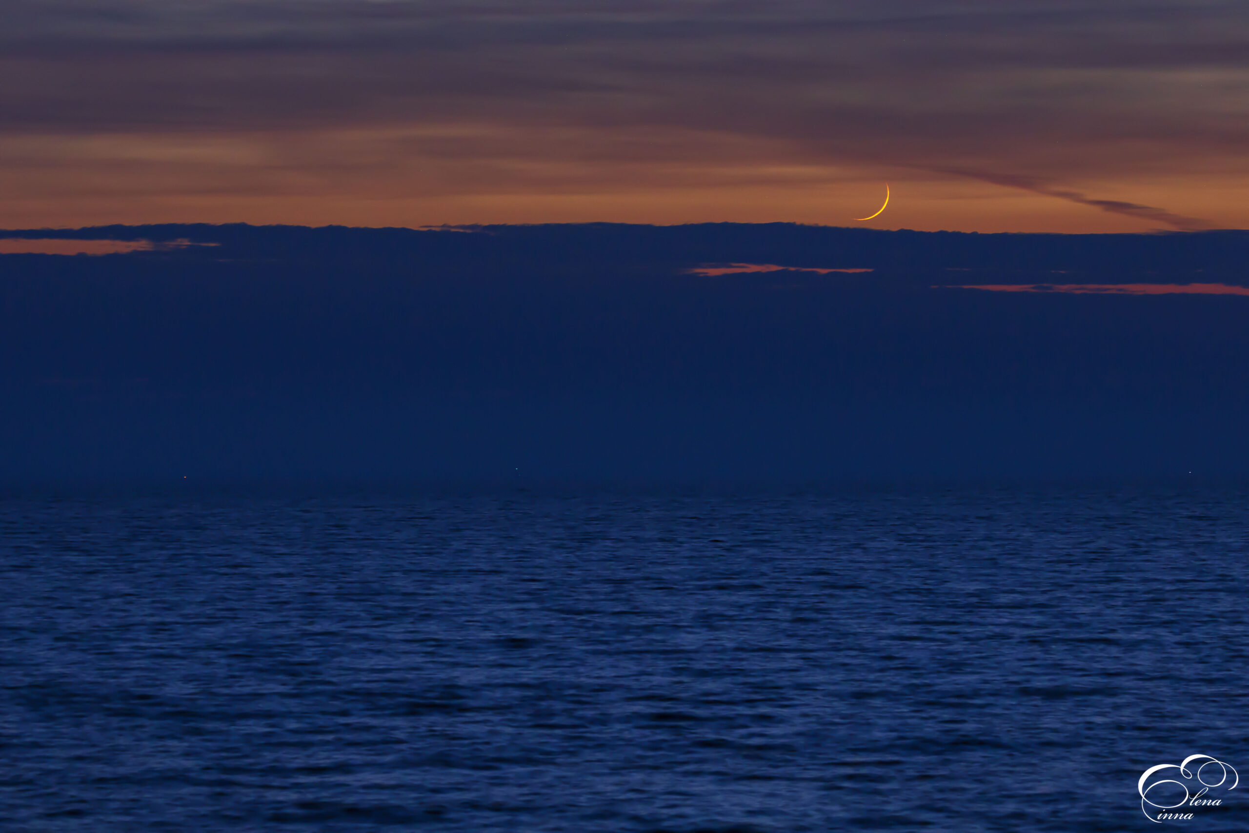Falce di luna crescente al 2.5% fotografata dalla spiaggia di Santa Giusta (Oristano, Sardegna). Le nuvole mi hanno impedito di vedere la fase conclusiva del tramonto ma, allo stesso tempo, hanno colorato il cielo di tanta bellezza.