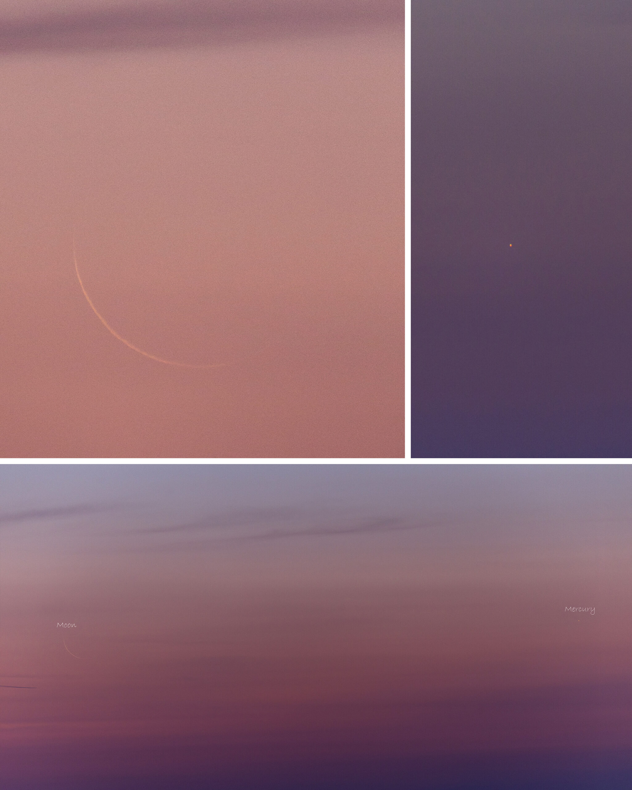 Una sottilissima falce di Luna, invisibile ad occhio nudo e illuminata all’1,1%, in compagnia del pianeta Mercurio. Colori indescrivibili che solo l’alba può regalare.