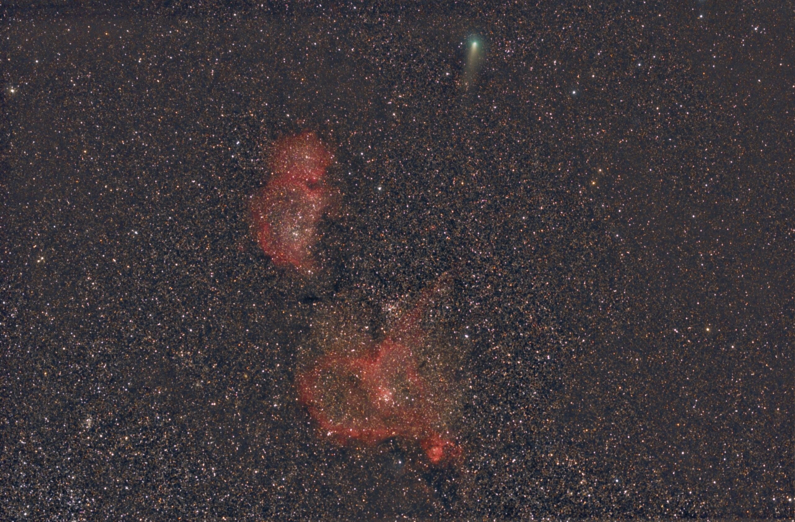 Ho raccolto l’incitazione di alcuni amici astrofili di riprendere la cometa 21P/Giacobini Zinner in prossimità delle nebulose Anima (IC1848) e Cuore (IC1805). Ho effettuato le riprese nelle prime ore del 19 agosto, attendendo il tramonto della Luna. L’elaborazione con Pixinsight è stata complessa, prima allineare prima le stelle, poi la cometa e infine fondere tutto insieme. Questo è il risultato finale.