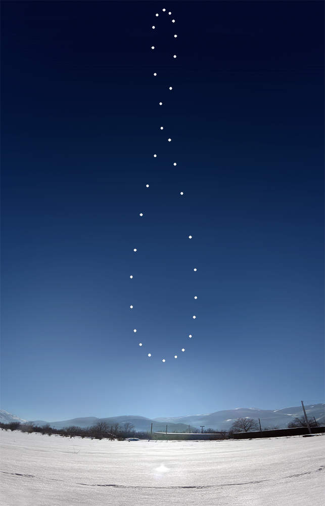 Questa figura a forma di 8 oblungo o di infinito oblungo, l’analemma, viene causata dall’inclinazione dell’asse terrestre e dall’ellitticità della sua orbita intorno alla nostra stella. Riprendendo il Sole, giorno dopo giorno, sempre alla stessa ora, ci si accorgerà che il Sole non rimane ‘fermo’ dal nostro punto di vista, ma si muove pian piano, andando appunto a descrivere questa figura.