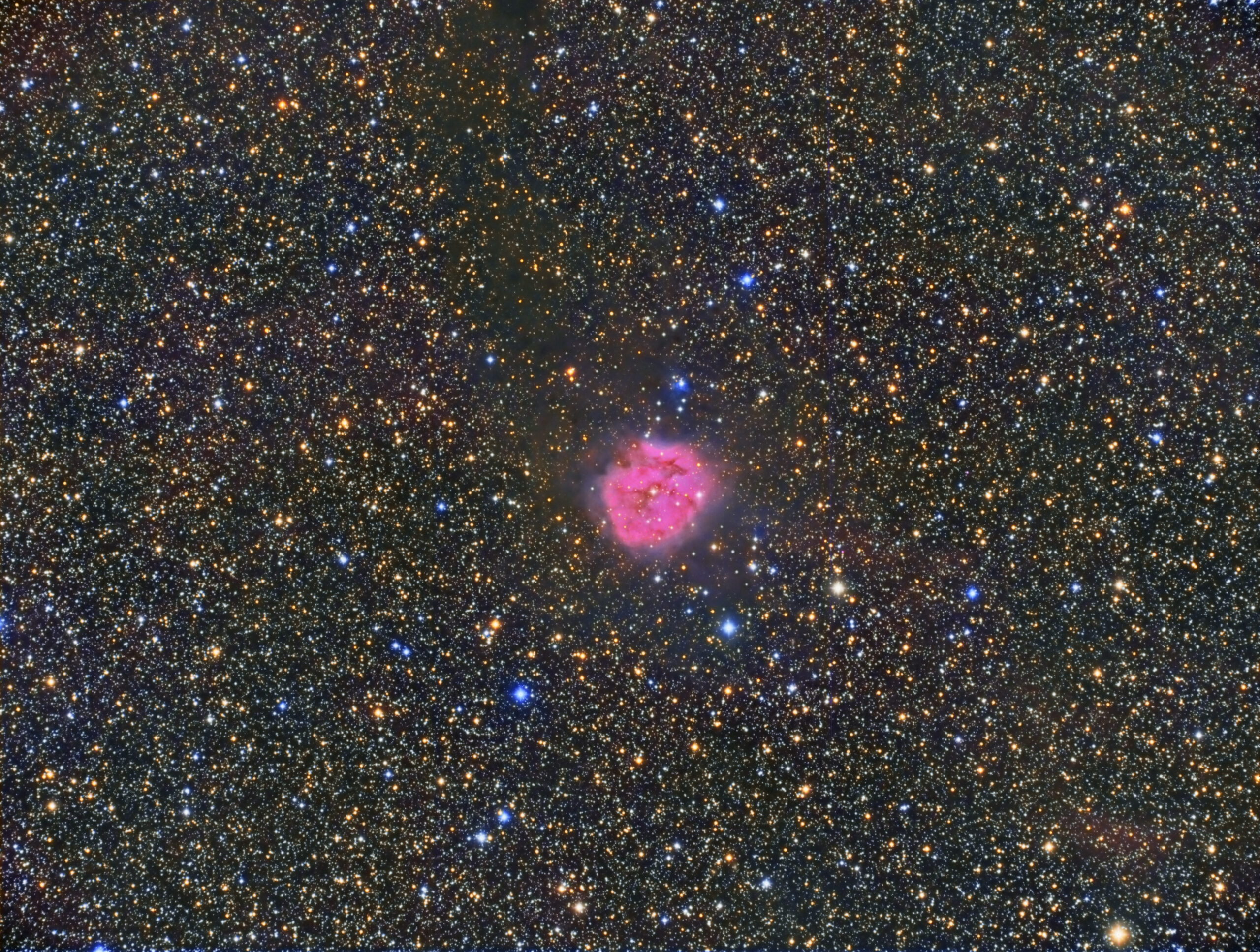 Situata nella costellazione del Cigno, IC5146 è un ammasso aperto immerso in una nebulosa soprannominata "Bozzolo" ma che in foto prende la forma di un bellissimo fiore rosa immerso in un’infinità di stelle. Questa nebulosa è collegata a sua volta a un sistema di nebulose oscure molto evidenti per la quantità di stelle che le circonda.