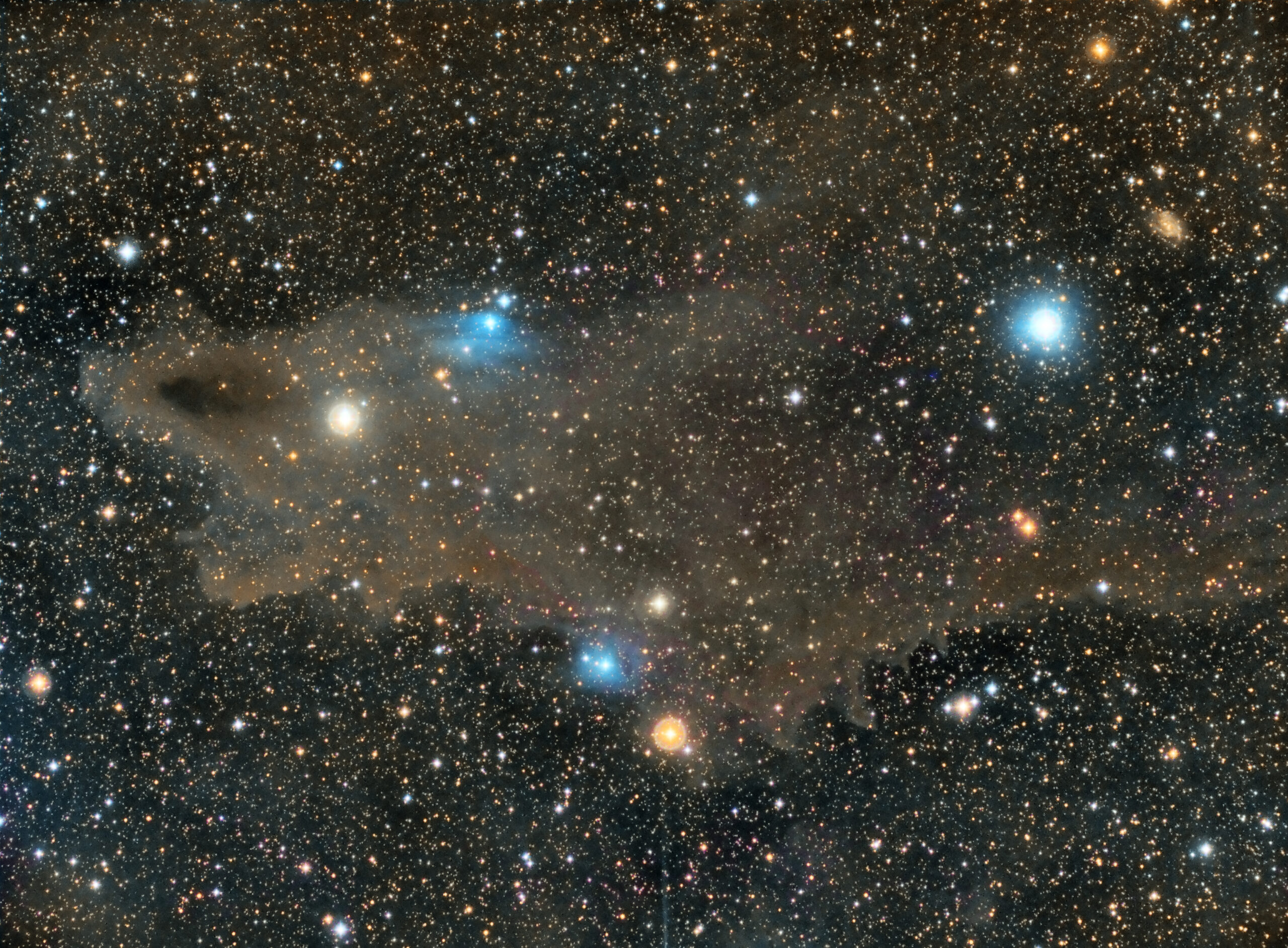 Nebulosa Squalo con sulla destra la galassia PGC67671, la nebulosa oscura è composta da gas e polveri interstellari. Si estende per circa 15 anni luce e si trova a circa 650 anni luce di distanza nella costellazione del Cefeo.
