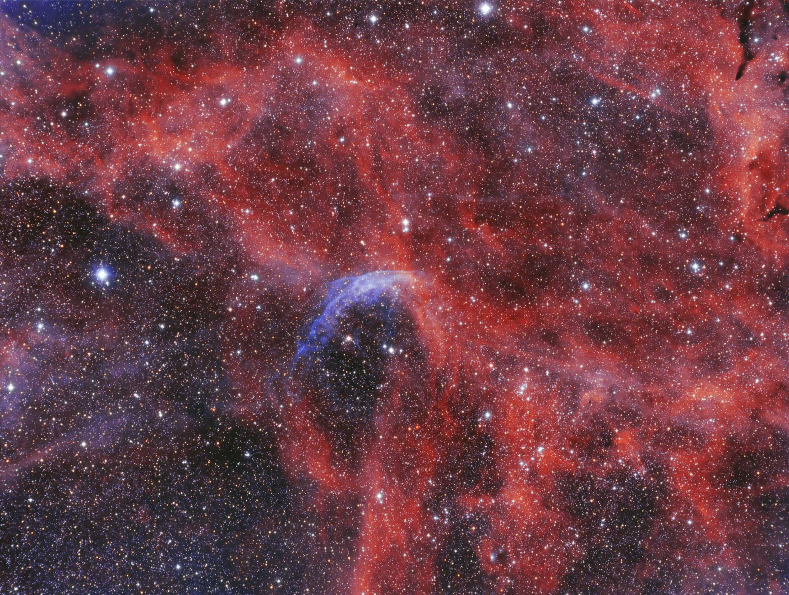 In questa nebulosa si evidenzia il bordo luminoso ad anello tracciata dal bagliore dell’idrogeno ionizzato e dell’ossigeno. Incastonati nelle nubi interstellari di gas e polvere della regione, il materiali sono trasportati dal vento dalla stella Wolf-Rayet WR 134.