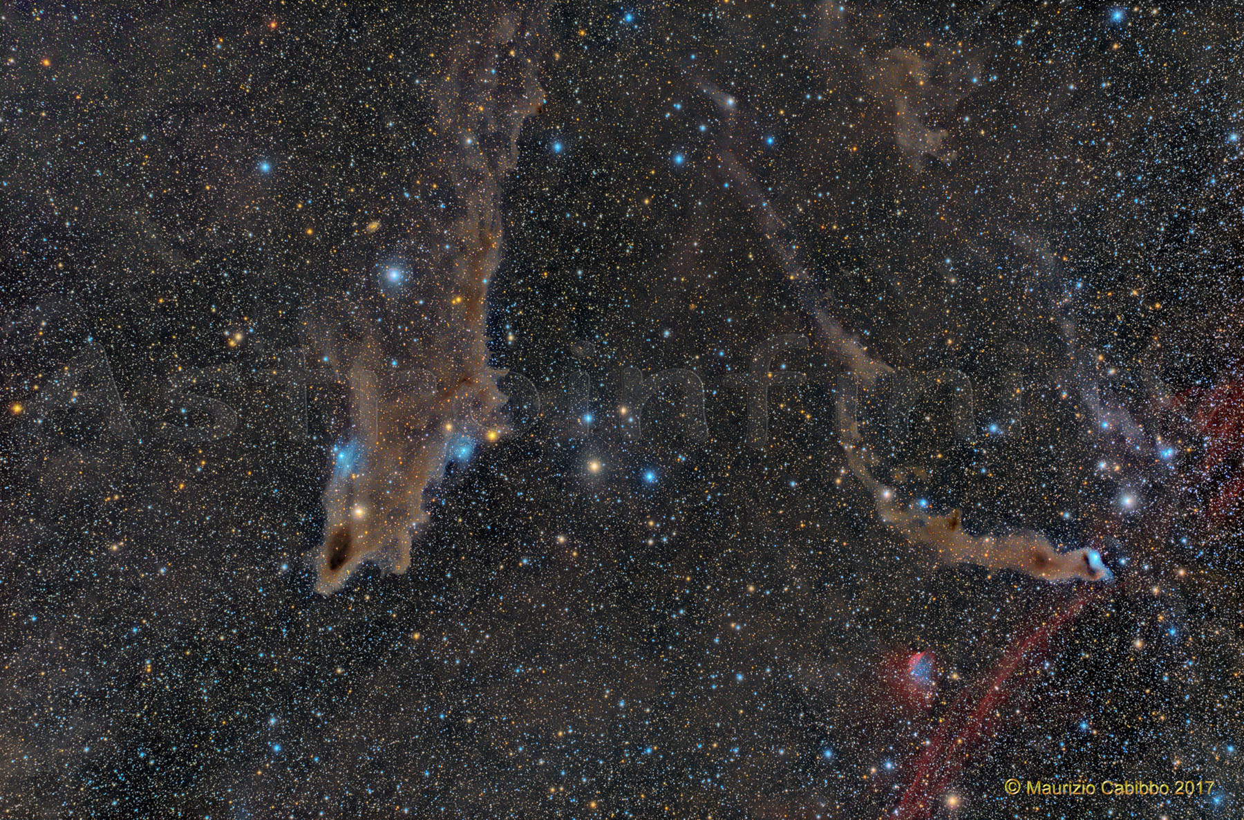 Nebulosa "Squalo" (LDN1235) e nebulosa "Vermone" (LDN1217) sono un vasto campo di nubi molecolari nella costellazione del Cefeo distanti da noi circa 1000 anni luce. Immagine ripresa con Takahashi FSQ106EDXIII e camera ccd Sbig STL11000 su montatura Losmandy G11. Autoguida Orion SSAG su Orion ST 80/400. Elaborazione LHRGB 900:420:180:180:180. Filtri: Astrodon Ha 6nm, Astronomik CLS CCD, Astronomik DeepSky RGB. Località di ripresa Casole d’Elsa, Radicondoli, Montieri