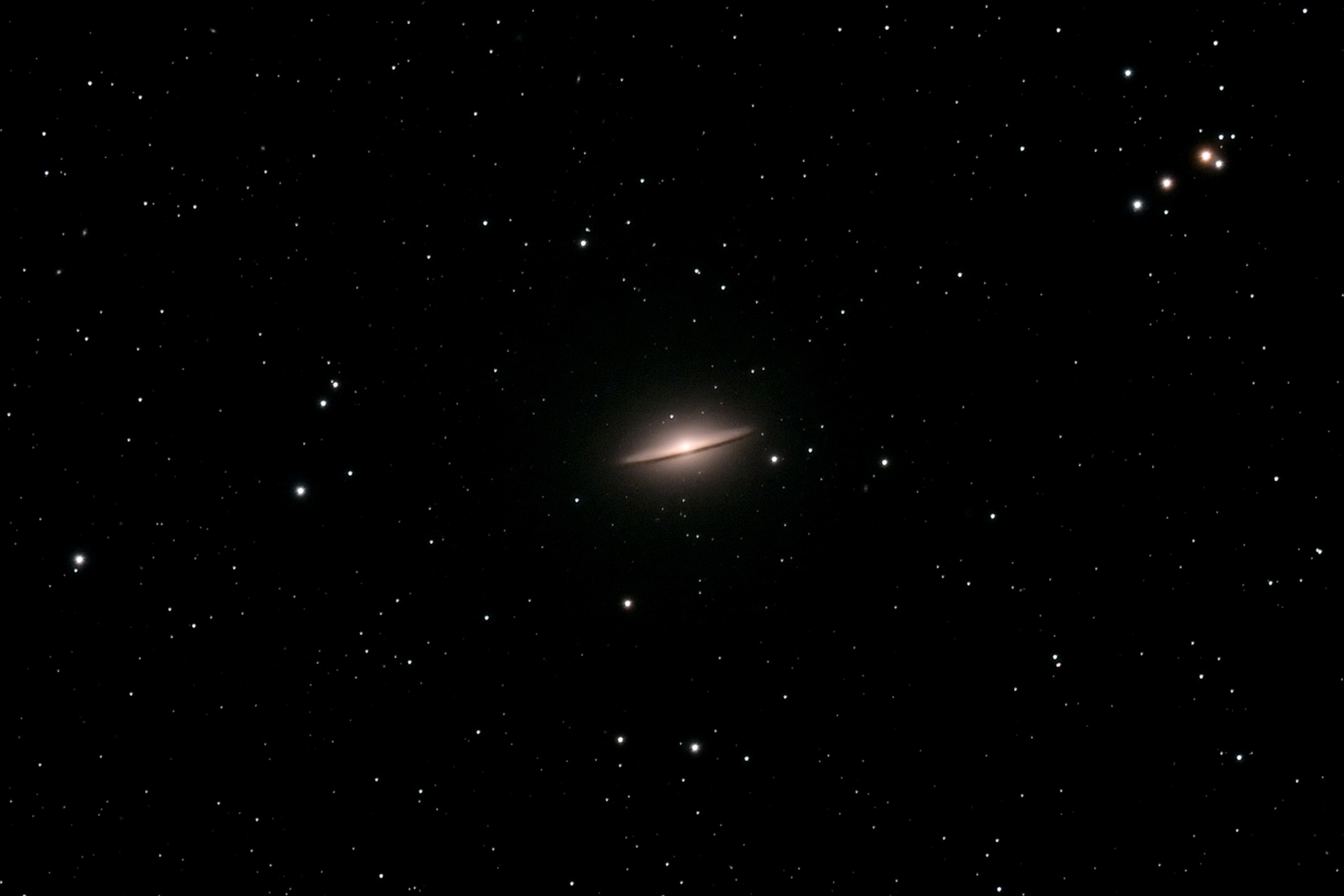 M104 Galassia "Sombrero" – VIR – Immagine ripresa con rifrattore apocromatico Takahashi TOA130, Guida con Orion Starshoot Autoguider su Takahashi FSQ106EDXIII – Montatura Losmandy G11 – Canon 1000D modificata filtro Baader Planetarium – 7 pose da 6 minuti – Osservatorio loc. "Montarrenti" (SI)