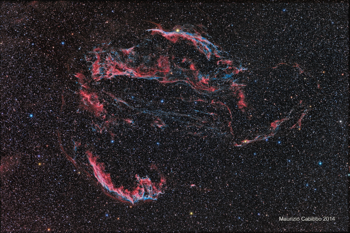 Lavoro concluso sulla magnificente nebulosa "Velo" nella costellazione del Cigno. Immagine ripresa con rifrattore apocromatico Takahashi FSQ106EDXIII @ f/3,6 e camera CCD SBIG STL11000. Elaborazione Ha-OIII-RGB. Filtri: Ha Astrodon Tru-Balance 6nm; OIII Astrodon Tru-Balance 6nm; Astrodon RGB. Ha 20x900sec; OIII 16x900sec; RGB 6x600sec. Software di elaborazione MaximDL, PixInsight e PS CS5. Località di ripresa Casole d’Elsa. Per una maggiore risoluzione www.astroinfinity.it
