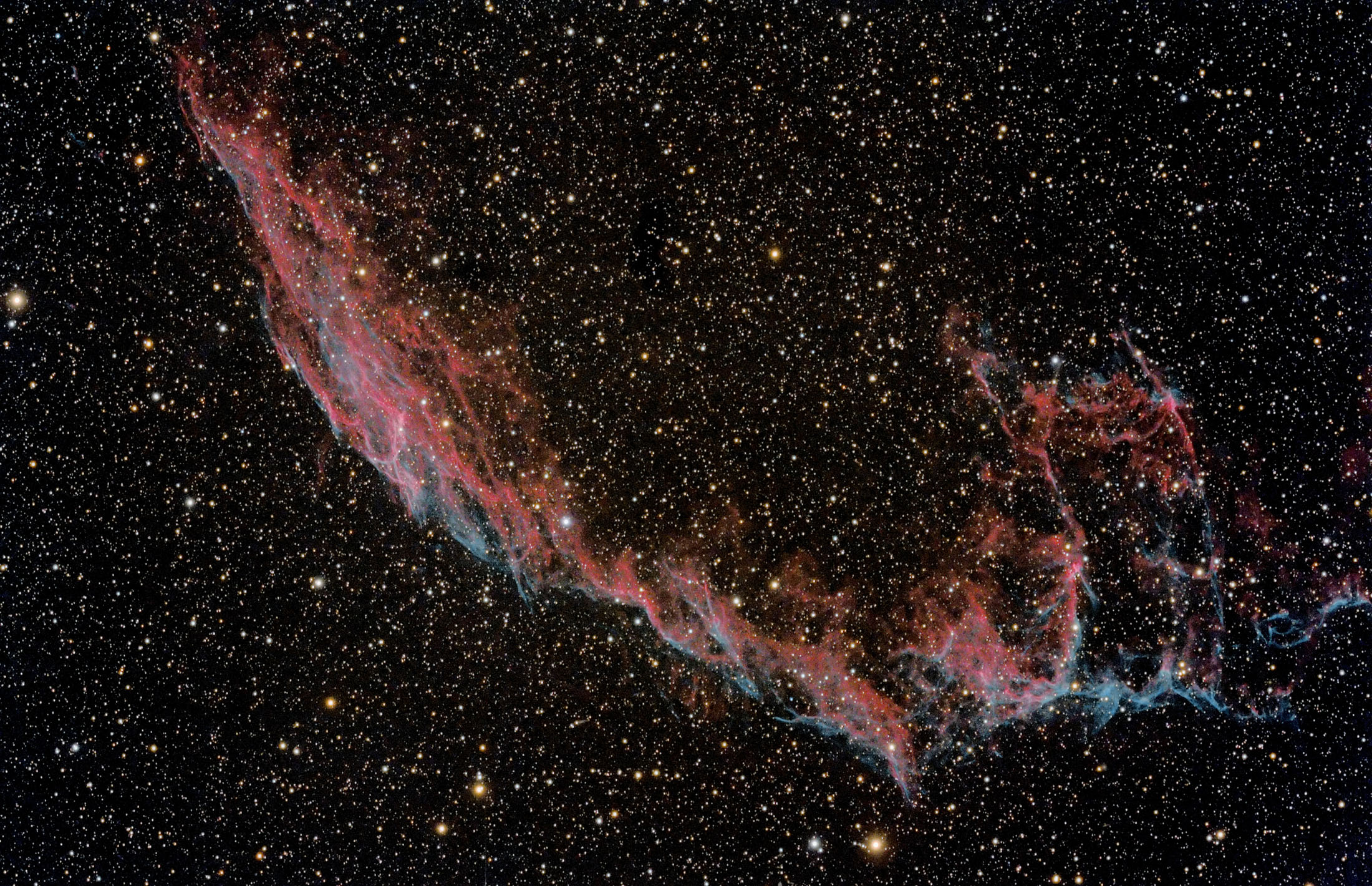 NGC6992-6995 nebulosa "Velo" – CYG – Immagine ripresa con rifrattore apocromatico Takahashi TOA130, Guida con Orion Starshoot Autoguider su Takahashi FSQ106EDXIII – Montatura Losmandy G11 – Canon 1000D modificata filtro Baader Planetarium – 11 pose da 6 minuti – Casole d’Elsa (SI)