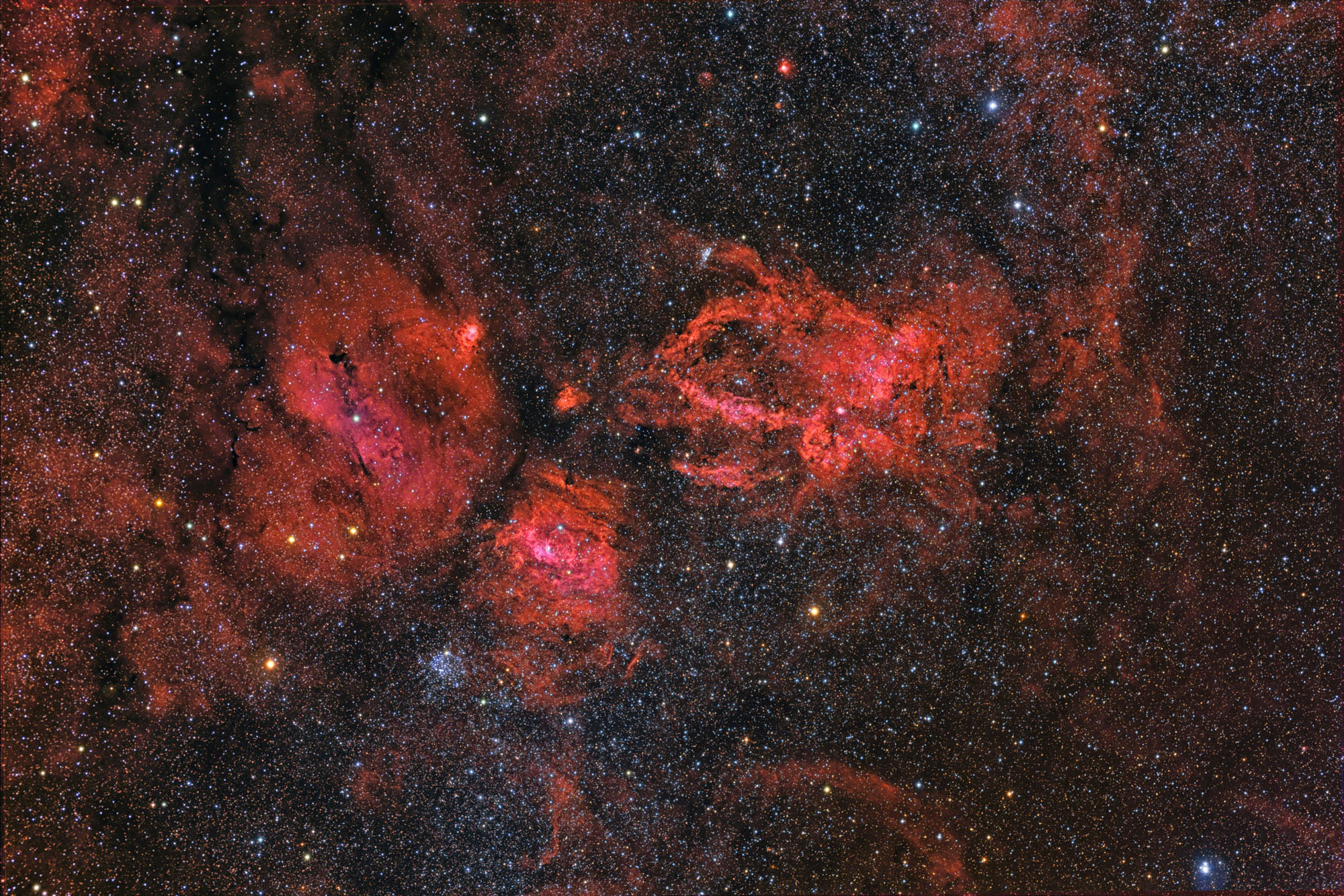 NGC7635 Widefield. Visibili nella foto da sinstra verso destra: Sh2-161 con il bozzoletto superiore NGC7538; NGC7635 "Bubble Nebula" con sopra la piccola Sh2-159 e sotto l’ammasso aperto M52; Sh2-157 con il piccolo ammasso aperto NGC7510; in alto quasi al centro leggermente spostato sulla destra la piccola IC1470. Ripresa effettuata con Takahashi FSQ106EDXIII f/3,6 e CCD SBIG STL11000. Elaborazione LHRGB 180:360:70:70:70 Località "Torre Doganiera", Pievescola, Casole d’Elsa (SI)