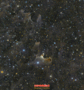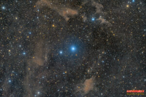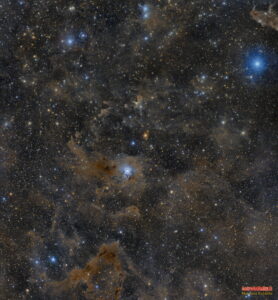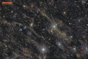 Regione di Antares ripresa con Takahashi FSQ106EDXIII f/3,6 e camera ccd Sbig STL11000 su montatura Losmandy G11. Autoguida Orion SSAG su Orion Short Tube 80/400. Elaborazione LRGB. Filtri Astronomik CLS CCD e Astronomik DeepSky RGB. Esposizioni 180:70:70:70. Software MxDL, PI 1.8 e PS CS5. Località Osservatorio Montarrenti – Sovicille – Siena