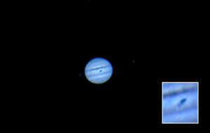Giove e le sue lune. Un’ inquadratura dove è possibile notare da sinistra verso destra: Ganimede, Io, Giove, Europa, e poco visibile e molto vicina a quest’ultima, Callisto. Elaborazione con registax 5
