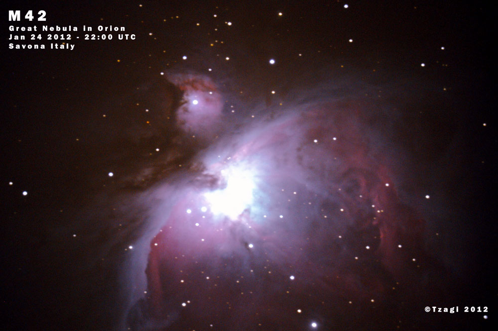 Serata osservativa e test fotografici dal Campus universitario di Savona. M42 fotografata in condizioni ‘cittadine’. 3 pose da 90 sec con Canon 7D non modificata al fuoco di un C8 ridotto a f/6.3 su CG5. Calibrazione, allineamento e stacking con Iris. Color correction in Photoshop.