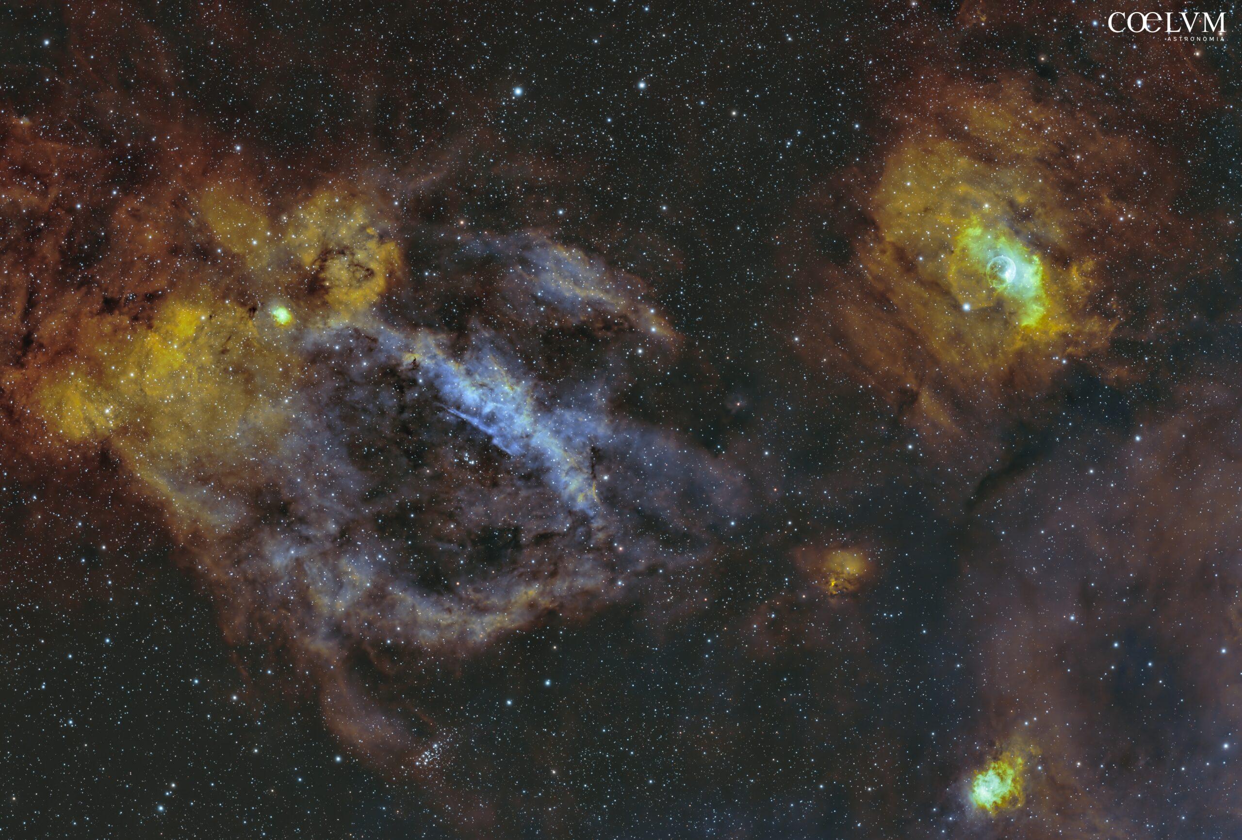 Sh2-157 e NGC 7635, rispettivamente Chela di Aragosta e Bolla, sono due soggetti ad emissione tipici di questo periodo dell’anno. Situate entrambe nella Costellazione di Cassiopea, la Chela si estende per 200 a.l. mentre la Bolla solo per 7. E’ curioso notare che entrambe le nebulose sono state scolpite da vento stellare di due diversi tipi di stelle. La luce ha viaggiato dai 7 ai 11 mila anni prima di sbattere rovinosamente sul mio telescopio