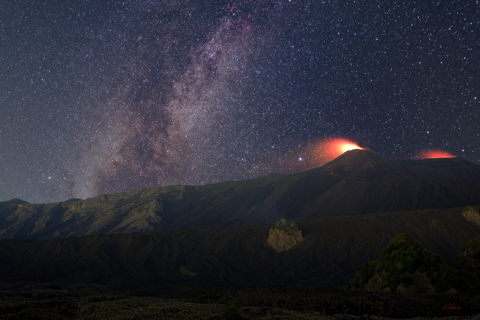 la foto ritrae la Via Lattea vista dalla Valle del Bove, sull’Etna. la parte inquadrata della Via Lattea è quella del triangolo estivo; in particolare, la stella luminosa a sinistra del cratere in eruzione è Vega, mentre in alto, al centro, si distinguono le nebulose attorno a gamma cigni.