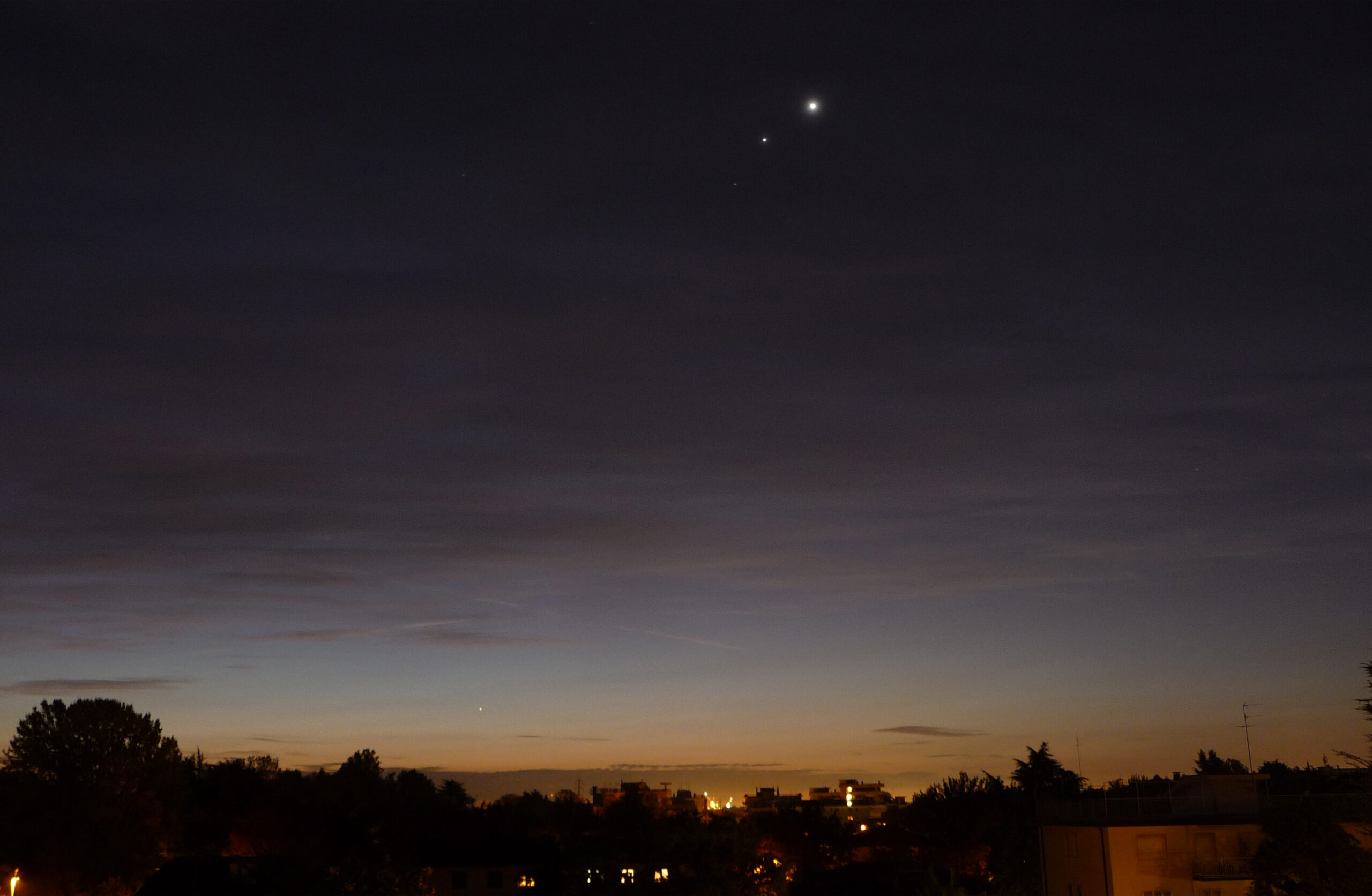 Sono riuscito a fotografare i 4 pianeti, nonostante le nuvole velate e le luci di Porto Marghera a soli 7 km, usando una normalissima fotocamera Panasonic TZ5 appoggiata sul telescopio !