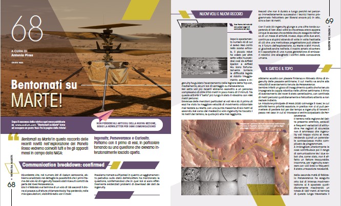 Ringraziamo ancora una volta Antonio Piras per il suo report dettagliato delle attività svolte dai rover su Marte: Bentornati su Marte! è l’appuntamento che in 6 pagine raccoglie tutto quello che c’è da sapere sul pianeta rosso e sulla sua rocciosa superficie.