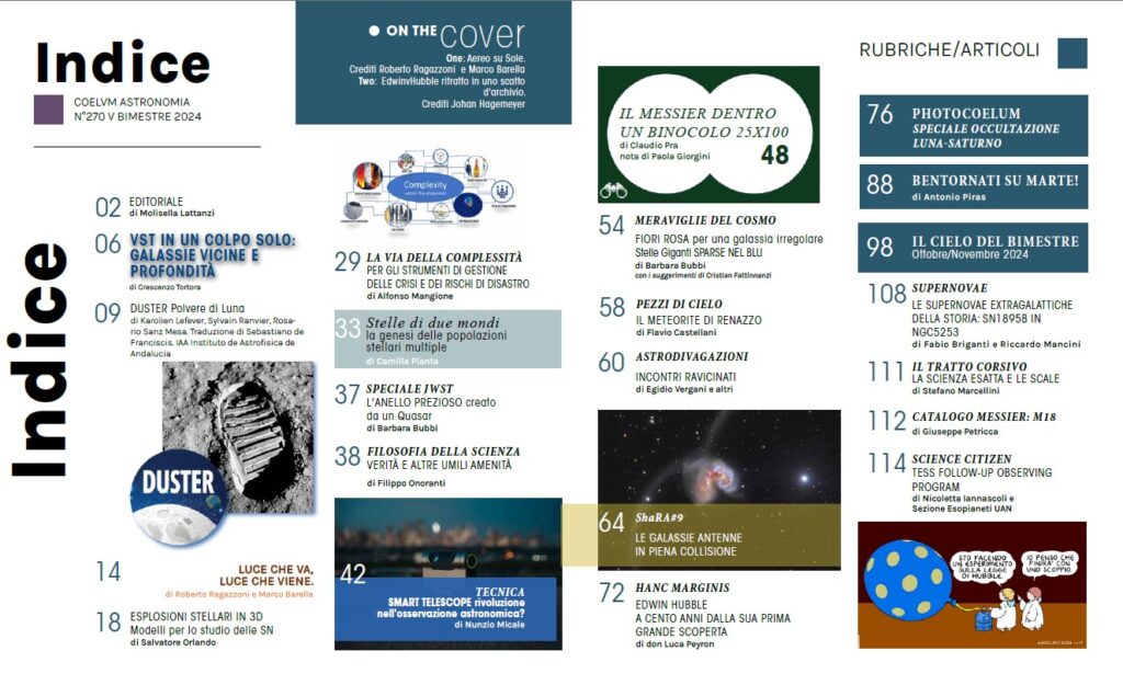 Non mancano gli aggiornamenti sulla Luna, Comete Asteroidi, Congiunzioni Pianeti e Sole, tutti gli eventi celesti dei mesi Ottobre/Novembre a cura di Francesco Badalotti, Claudio Pra, Teresa Molinaro, Marco Iozzi, Giuseppe Petricca, Fabio Brignanti e Riccardo Mancini.