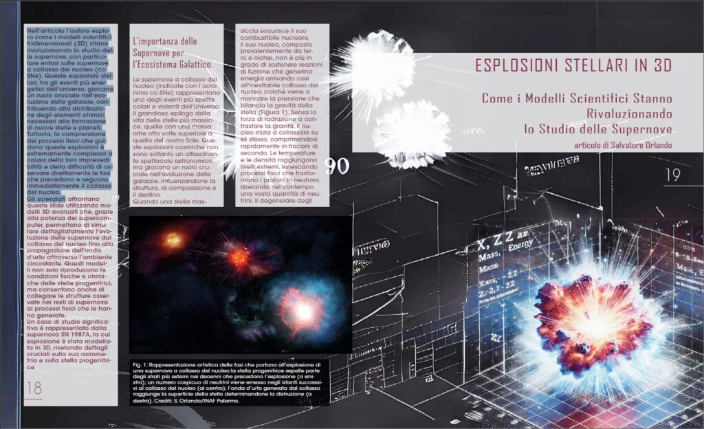 Nell’articolo l’autore esplora come i modelli scientifici tridimensionali (3D) stiano rivoluzionando lo studio delle supernove, con particolare enfasi sulle supernove a collasso del nucleo (cc-SNe). Queste esplosioni stellari, tra gli eventi più energetici dell’universo, giocano un ruolo cruciale nell’evoluzione delle galassie, contribuendo alla distribuzione degli elementi chimici necessari alla formazione di nuove stelle e pianeti.
