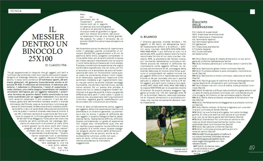 Claudio Pra condivide con i lettori di Coelum la sua maratona Messier durata quasi un anno. Pra, con il suo fedele binocolo si lascia catturare dalle meraviglie degli oggetti più notevoli del nostro cielo e riporta, per ciascuno di essi, la sua valutazione sulla visibilità.