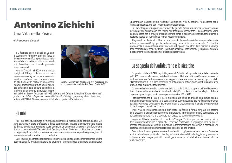 Il nuovo numero di Coelum Astronomia si apre con un ricordo dedicato ad Antonino Zichichi, raccontato da Francesco Vissani. La scomparsa del fisico siciliano diventa l’occasione per ripercorrere una vita interamente dedicata alla ricerca scientifica e alla costruzione di grandi progetti internazionali. Dalla scoperta dell’antideuterio alle attività al CERN, fino alla fondazione del Centro di Cultura Scientifica “Ettore Majorana” di Erice, emerge il ritratto di uno scienziato che ha attraversato oltre sessant’anni di fisica delle particelle contribuendo allo sviluppo di infrastrutture, esperimenti e programmi educativi legati allo studio dei raggi cosmici.