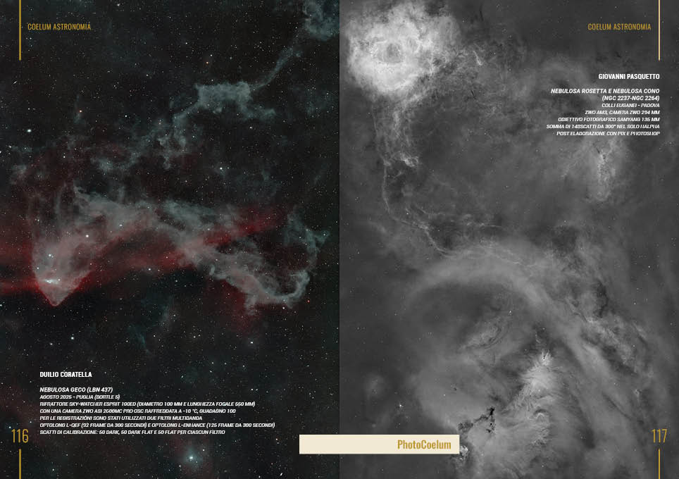 Nelle pagine di PhotoCoelum torna una galleria costruita sul lavoro di molti autori, con contributi firmati da Davide Sarrocco, Simeone Pendolo, Duilio Coratella, Giovanni Pasquetto, Claudio Gentile, Cosimo e Luca Pilotto, Cristian Fattinnanzi, Andrea Marinelli, Paolo Marinoni, Stefano Camaeti, Aldo Lenzi, Alessandro Passeggia e dall’Associazione Astrofili Pisani. In apertura trova spazio anche APOC n°14, con The Coelum Wall of Fame che mette in evidenza come vincitore Manuel Innocenti con Nebulosa Bozzolo – IC 5146 (nel riquadro UGC 11806 e UGC 11802), premiando uno scatto che apre la sezione e ne definisce subito il livello.