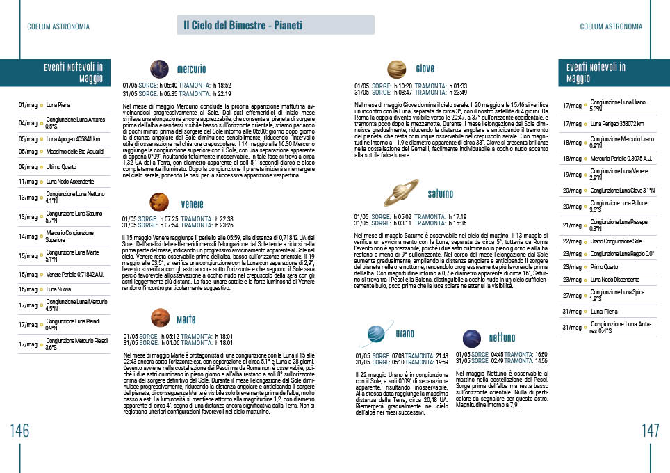 Ampio spazio è riservato anche a Il Cielo del Bimestre, che occupa 20 pagine, dalla 128 alla 147, e accompagna i mesi di aprile / maggio 2026 con una sezione centrale per la consultazione del numero. Il percorso è affiancato anche dagli approfondimenti disponibili online, con La Luna del mese di Francesco Badalotti, Mondi in miniatura – Asteroidi di Marco Iozzi, Le comete osservabili di Claudio Pra.