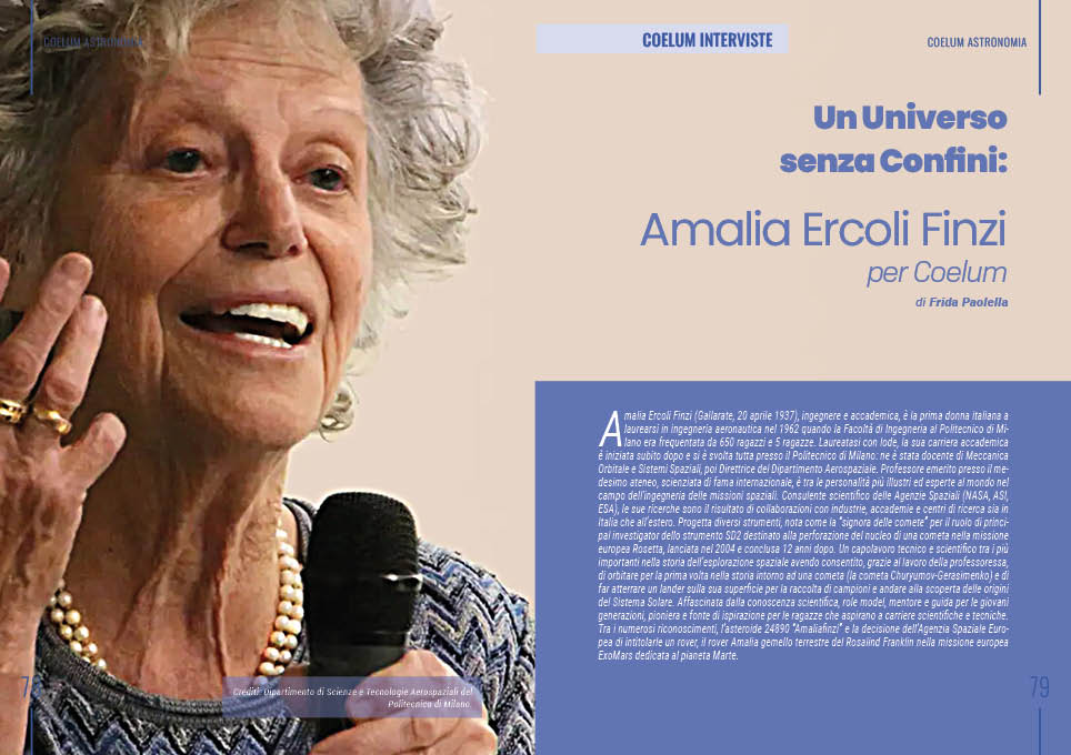 Uno spazio importante è dedicato all’esplorazione con Un Universo senza Confini: Amalia Ercoli Finzi, intervista raccolta da Frida Paolella. La “signora delle comete” ripercorre il proprio percorso nella ricerca spaziale e il contributo italiano alle missioni planetarie: diretta, sincera e spontanea nel sottolineare cosa va e cosa proprio non va.