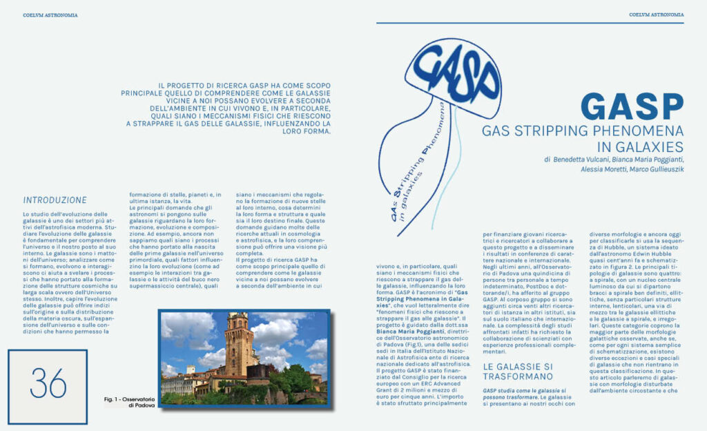 Il progetto di ricerca GASP ha come scopo principale quello di comprendere come le galassie vicine a noi possano evolvere a seconda dell’ambiente in cui vivono e, in particolare, quali siano i meccanismi fisici che riescono a strappare il gas delle galassie, influenzando la loro forma.