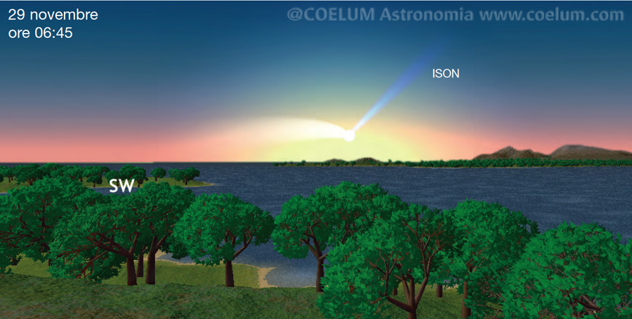 29 novembre Se la cometa sarà sopravvissuta al passaggio ravvicinato con la nostra stella e la radiazione solare sarà stata tale da produrre una lunghissima coda di ioni e polveri, si potrà forse sperare di vedere la cometa praticamente adagiata sull’orizzonte ovest-sudovest; solo alle 16:45 però… dato che, per effetto della rotazione intorno al disco solare, la cometa potrà – eventualmente – essere osservata soltanto la sera, con il tramonto del Sole.