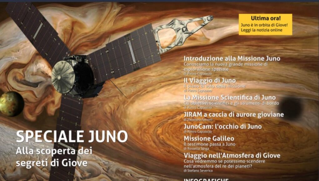In attesa che vengano pubblicati i primi risultati delle nuove indagini condotte dalla sonda Juno su Giove, vi invitiamo alla lettura di questo arretrato di Coelum Astronomia, n° 202 del 2016, ben 50 pagine di Speciale Juno in cui sono state raccolte tutte le informazioni relative alla missione. Lancio, strumenti, orbita, obiettivi e curiosità. Sarà divertente fare il confronto con i dati che in questi mesi verranno ulteriormente rilasciati dalla NASA.