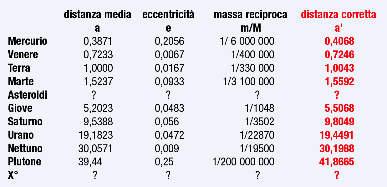 dove a’ è la “distanza corretta”, m/M è il rapporto tra la massa del pianeta e quella del Sole, e k è una costante di proporzionalità che vale 48. Applicando tale impostazione alla successione delle distanze, Gutiérrez ottiene i risultati evidenziati in rosso nella tabella in basso (se il lettore desidera verificare, si aiuti con i dati elencati).