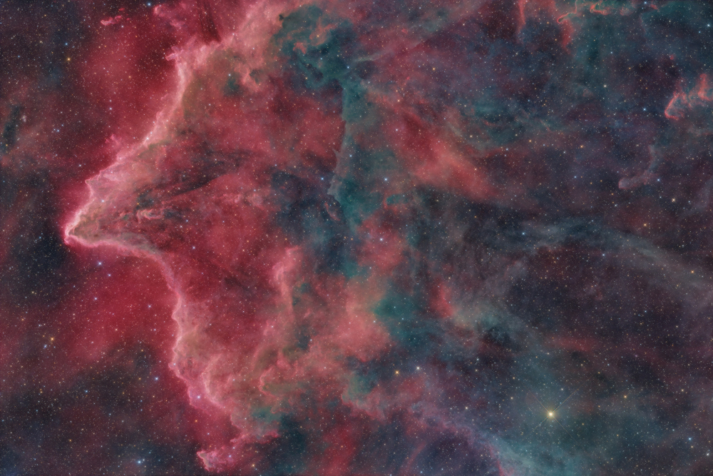 Nel progetto ShaRA#12 il team ha elaborato l’immagine della nebulosa NGC 3576, detta “Statua della Libertà”, utilizzando dati LRGB e banda stretta SHO. Grazie a 69 ore di acquisizione da un telescopio in Cile, ogni membro ha proposto una resa cromatica personale. Il superstack finale restituisce una visione spettacolare della nebulosa in Hubble palette.